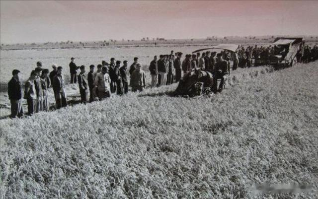 1973年,国营君山农场认真贯彻“以粮为纲,全面发展”的方针,农业生产获得很大发展,在当地农村起了示范作用,这是岳阳地区各县干部社员代表在参观湖南省国营君山农场机械收割情况。