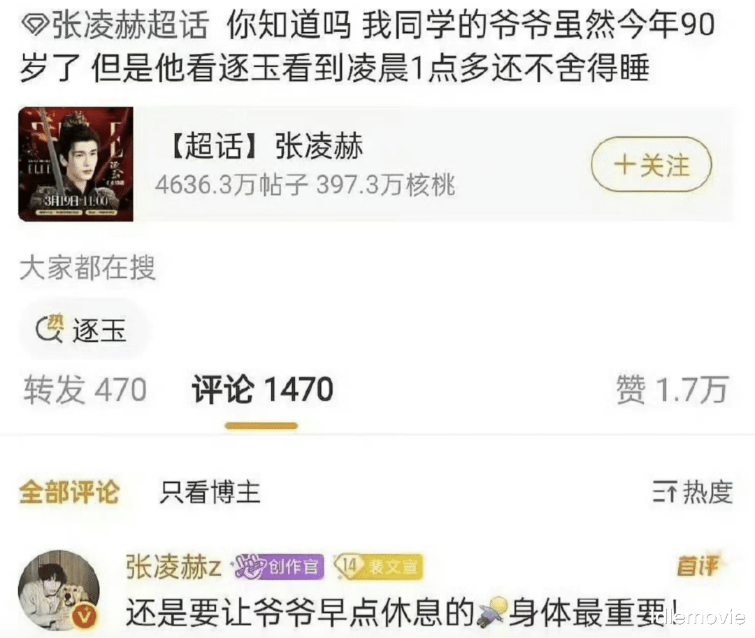 张凌赫让90岁追剧爷爷早点休息,还上了高位热搜,离谱程度堪比《惊蛰无声》上映时的统一话术,我们家祖孙三代都爱看。