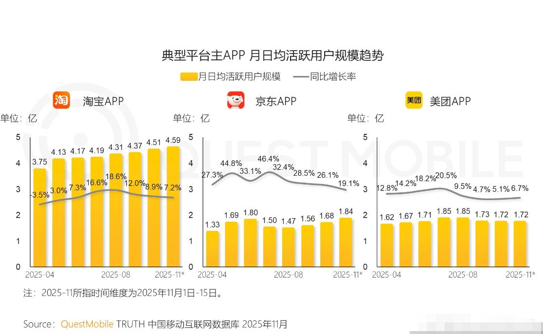 QuestMobile数据显示,外卖的高频需求正在带动全品类即时零售生态协同发展,可以看到淘宝APP的月日均活跃用户随着闪购业务的开展,正在连月上升,11月份已经达到4.59亿。
