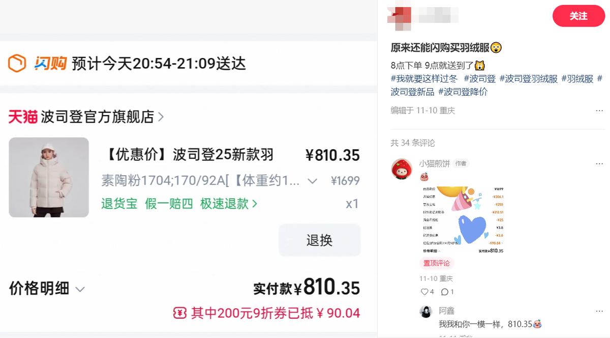 可以看到有网友发文称还能闪购买羽绒服,8点下单,9点就送到了。