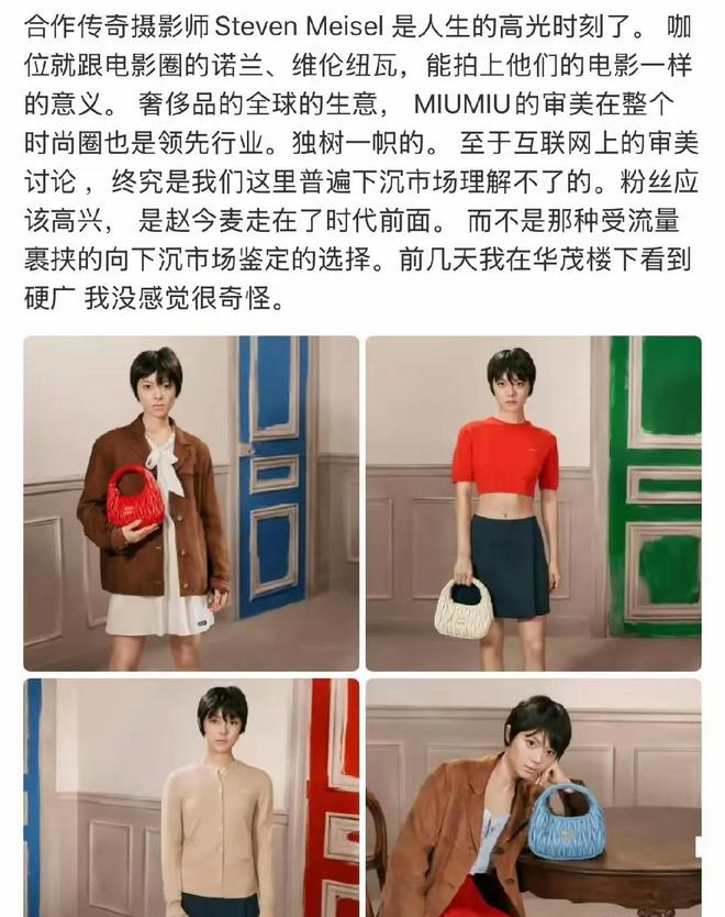 有时候真的搞不懂摄影师到底是想表达什么主题,给她配了裙子,却又给她穿了一件非常中性的工装外套,再搭配她的短发,一整个不伦不类的感觉。肤色给她画的那么深,再加上脸颊凹陷,看上去一副营养不良的样子。后面的这两套更是一言难尽。真的是,都不想多说什么。但是她的粉丝真的是自带滤镜,觉得非常有个性,然后赵今麦拍摄出来的效果也很好,甚至说这次给她拍摄的摄影师也是非常牛的一位。合作的摄影师很牛,是一部分,但是拍出来的效果确实是很一般呀,而且也完全不适合她。抛开粉丝来说,路人的评价真的很真实,完全是理解不了她的这次拍摄的妆照。路人都觉得是可以维权的程度,只有一部分粉丝还在夸,讲真的,你们是真的觉得好看吗?下次真的避雷这个造型师吧!
