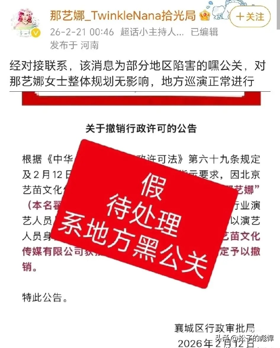 搞笑的是,那艺娜2.21日发微博辟谣说经过自己联系公司等,劣迹艺人以及公司被撤销盈利性演出许可证是假消息[捂脸],为黑公关发的。