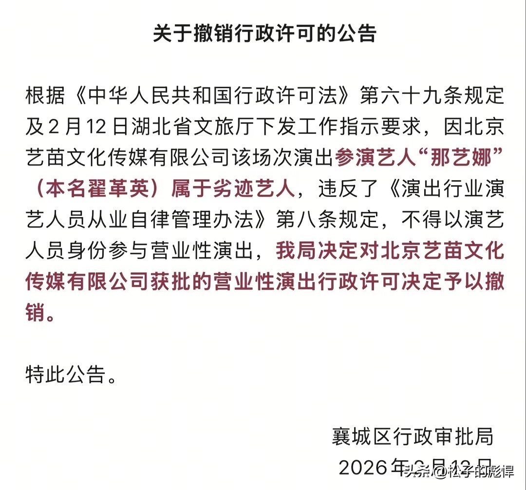 里面就是说因为北京艺苗文化传媒公司旗下参演艺人,那艺娜是劣迹艺人,不得参加盈利性演出。现在演了_……就是违反规定。