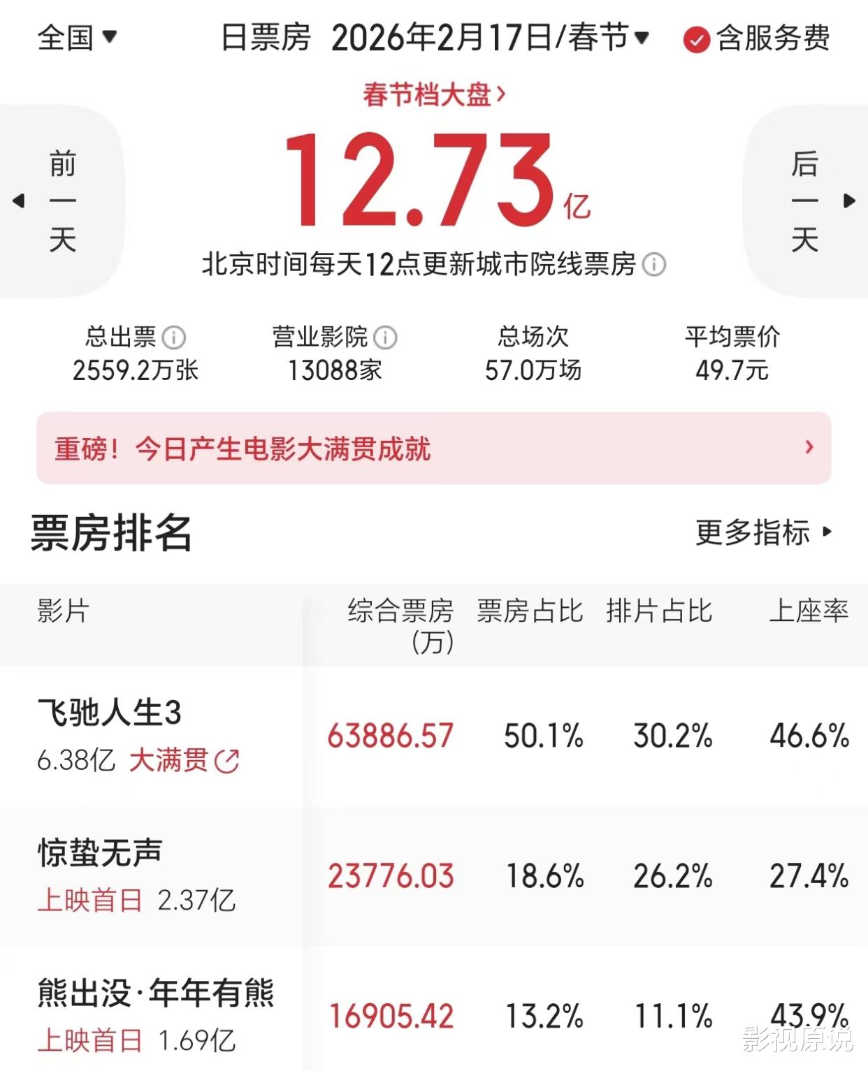 现在,春节档第二天才刚过半,当日累计总票房3.44亿人民币,《飞驰人生3》自己已经接近2亿人民币,占比超50%。