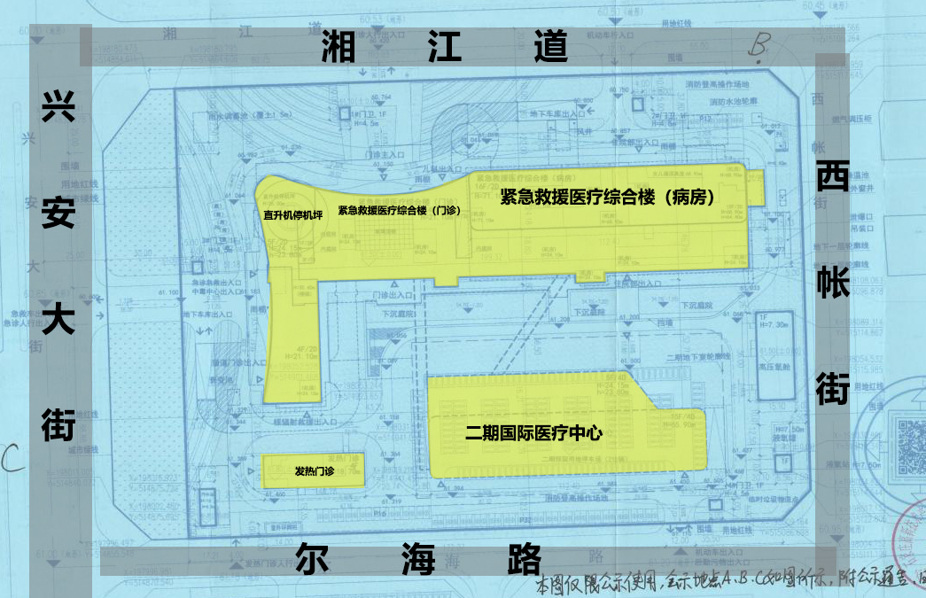 根据公示可知,项目用地性质为医疗卫生用地,用地面积4.6345公顷(约合69.51亩),容积率为2.499,本期规划医疗综合楼,总层高4-16层;发热门诊,总层高4层;高压氧舱,总层高1层;液氧站,总层高1层;污水处理站,总层高1层;以及1-4#门卫。