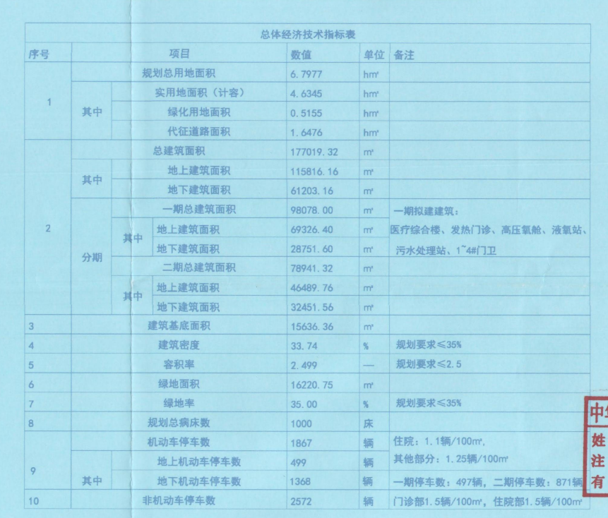 根据总体经济技术指标表显示,规划总用地面积6.7977公顷(约合101.96亩),总建筑面积177019.32平方米,建筑密度33.74,容积率2.499,绿地率35.00%,规划总病床数1000床,地上机动车停车数499辆,一期地下机动车停车数497辆,非机动车停车数2572辆。