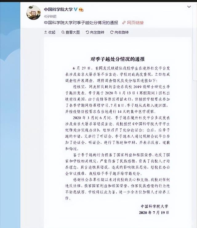 背叛历史的代价沉重7月19日,中国科学院大学官方发布通报,宣布对季子越开除学籍。