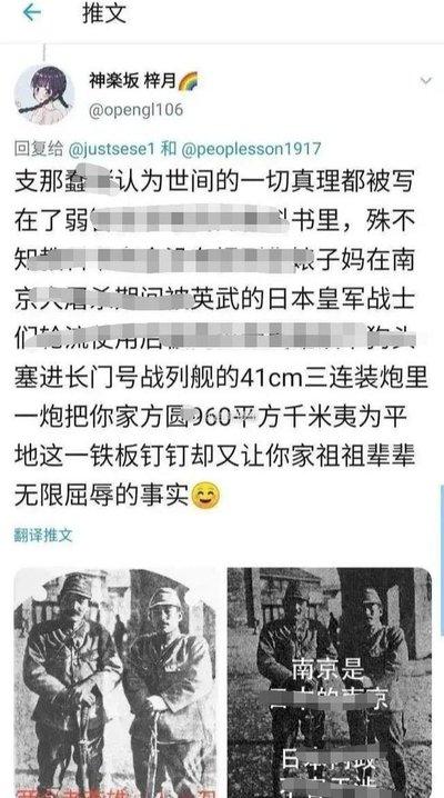 包括“南京是日本的南京”“侵华日军是老英雄”“中国不配作为一个独立国家”等,言辞极其偏激和恶毒。
