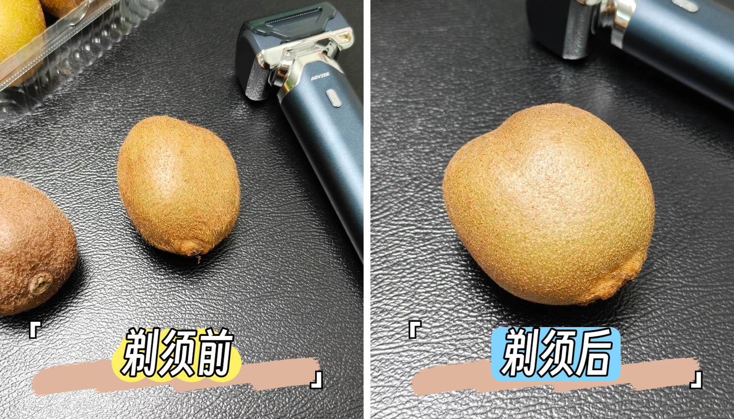 我特意用猕猴桃做了实测,前后差别很明显。未野MRX的刀头能很好地贴合猕猴桃的表面,轻轻一刮就能把表皮的绒毛剃干净,剃过的地方摸起来滑溜溜的,和没剃的地方对比很直观,也能看出来它的贴合度和剃净效果都不错。