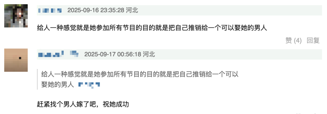 另一边,《我家那闺女》里的管乐,也让人看得直摇头。节目里别的女嘉宾也聊婚恋,但就属她最执着,开口闭口就是“想谈恋爱”、“好想结婚”。找朋友介绍、公开征婚,每期节目都绕不开这个主题,网友都看腻了,说她“无聊”。