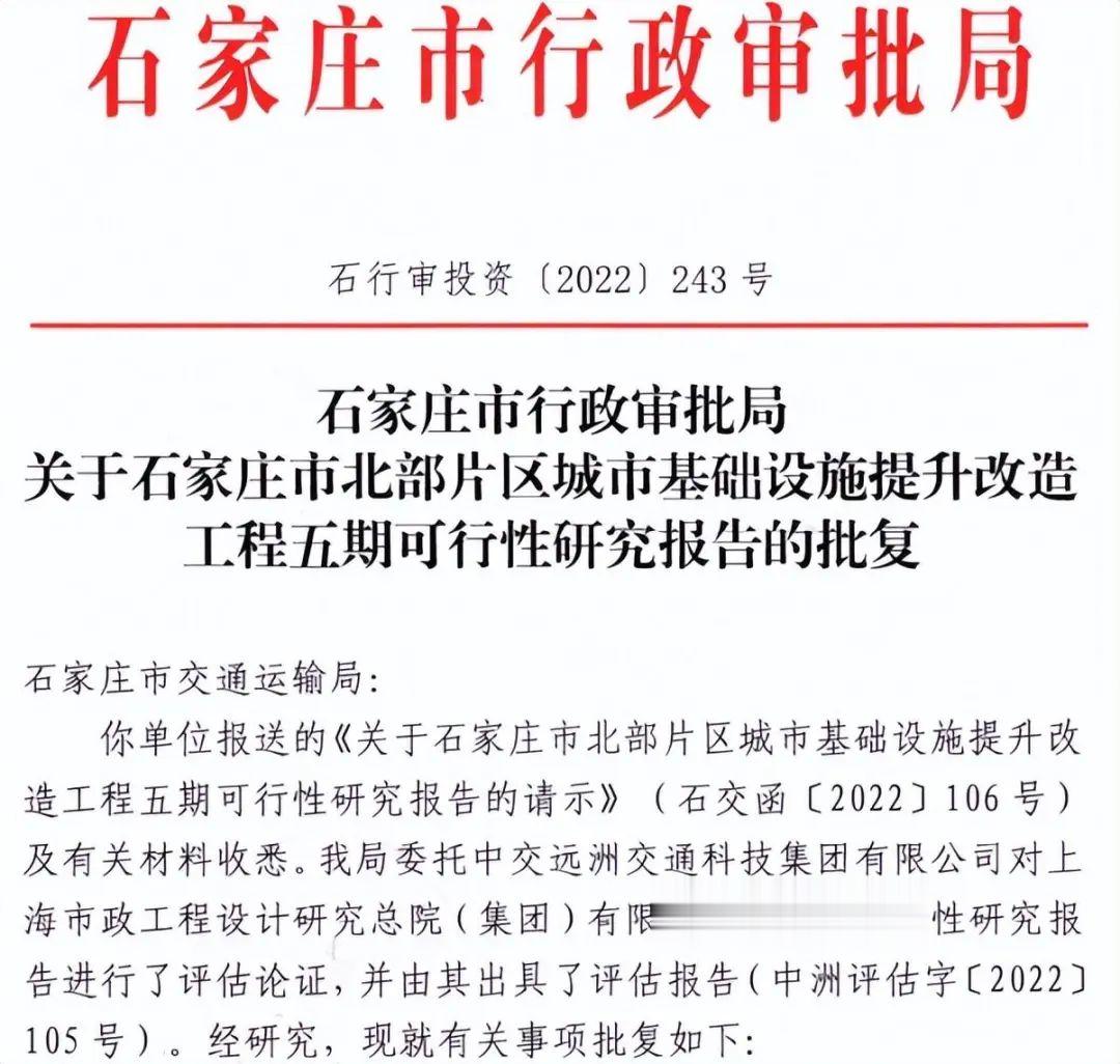 石家庄市行政审批局近日发文,对石家庄市北部片区城市基础设施提升改造工程五期可行性研究报告做出批复。