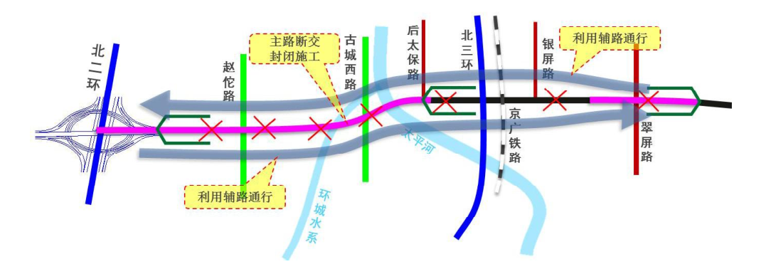 项目采用部分封闭模式,管线切改、新建施工、匝道施工时保证两侧辅路通行,主路施工完成后,开放主路交通,对桥下辅路进行封闭施工。