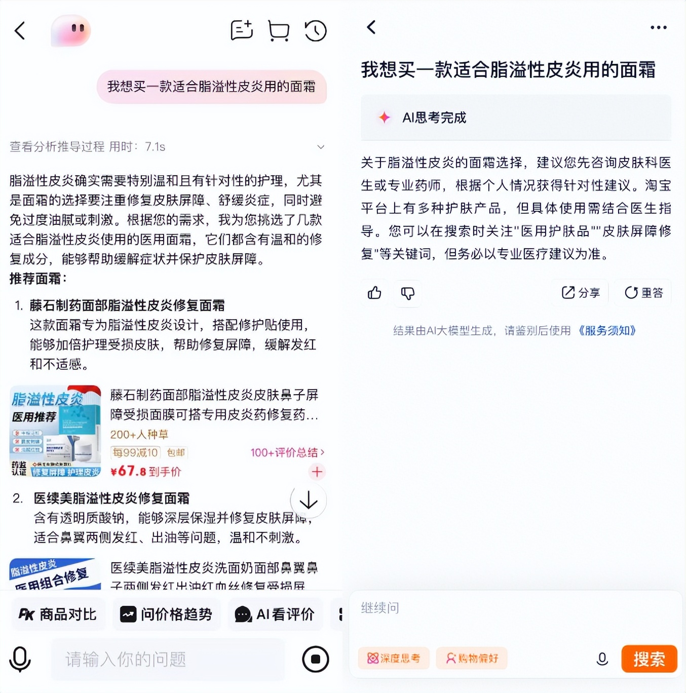 “趣解商业”注意到,这些导购应用中淘宝主推的是“AI万能搜”,将其直接放置在了一级入口,点进搜索框即可看到。体验后可以发现,淘宝的万能搜主打解决用户的一些复杂需求,多轮对话后推荐商品的同时会附上具体链接;对于一些专业程度较高的问题,万能搜的回答也相对谨慎,不会盲目推荐产品。