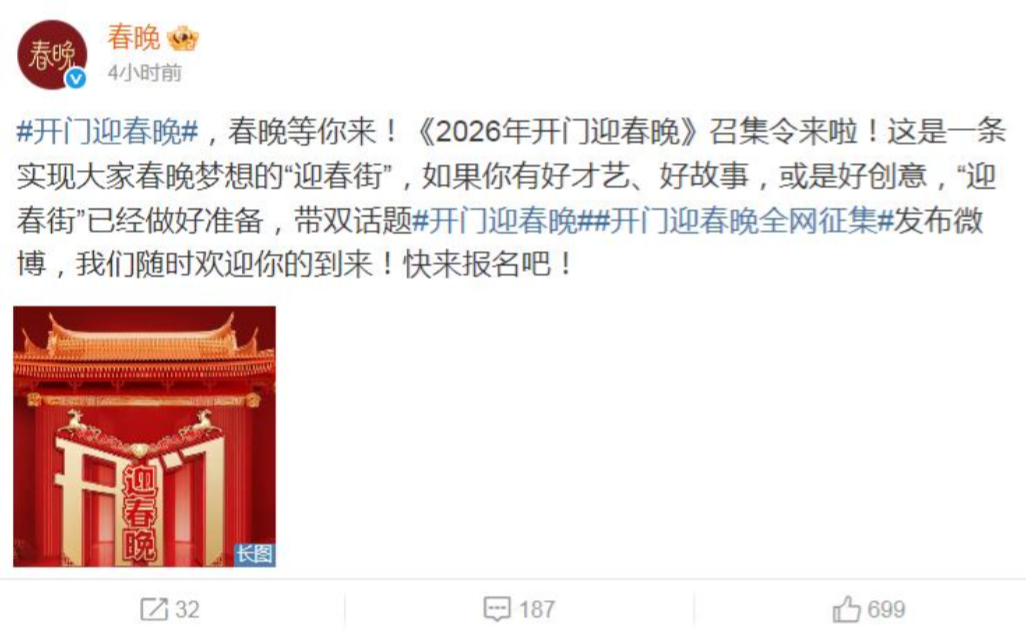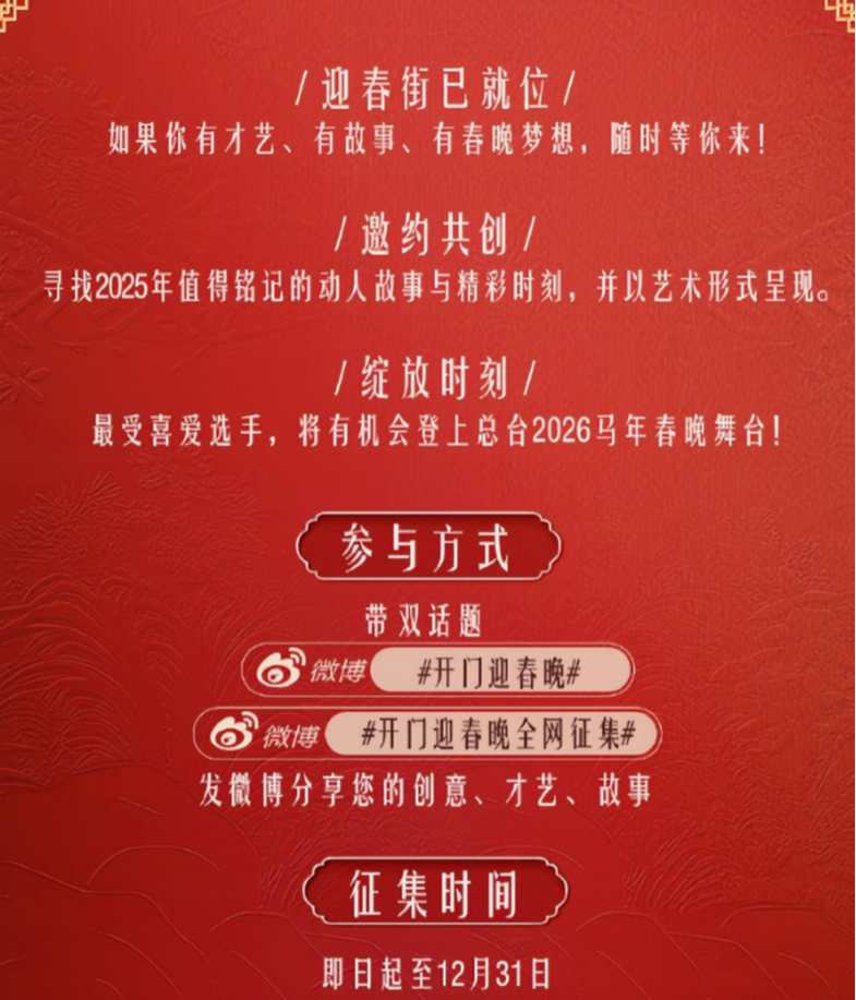 12月3日,央视春晚官方突然抛出“开门迎春晚”征集令,宣布2026年马年春晚正式启动节目招募。