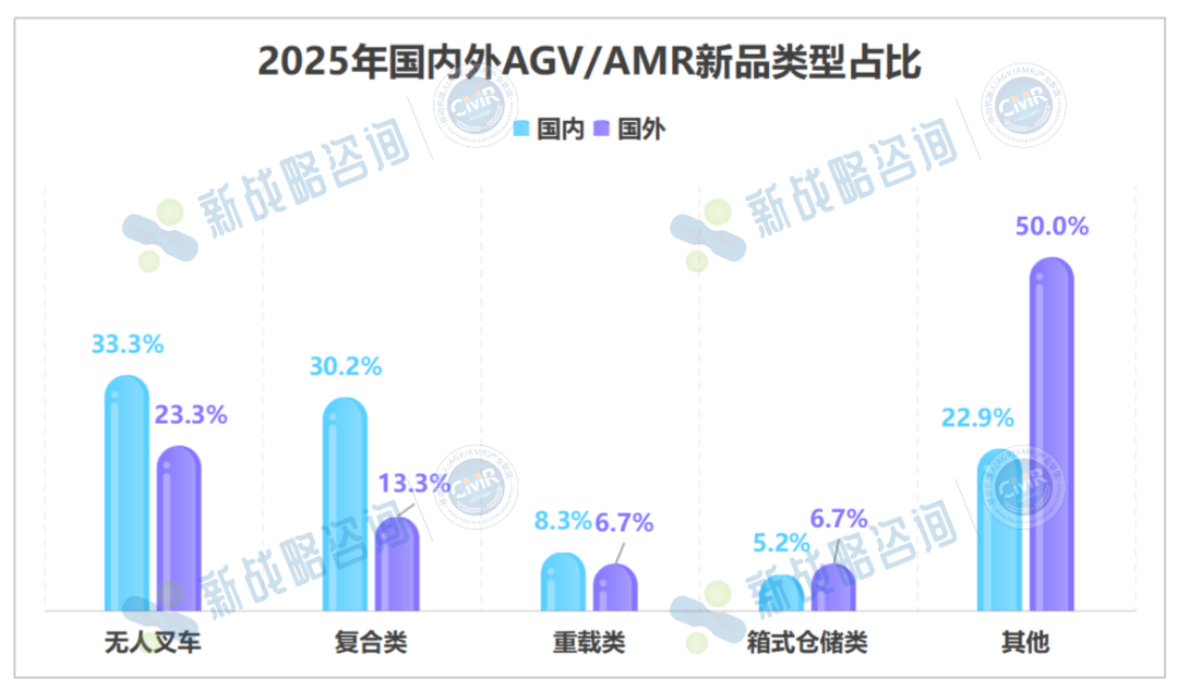 从2025年国内外AGV/AMR新品类型占比图中可以看出,国内外企业在产品布局上呈现出相似的趋势,其均重点聚焦于无人叉车与复合机器人品类。具体来看,国内市场表现尤为集中,超过六成的新品属于这两大类,反映出其对规模化落地和场景快速适配的强烈诉求。与此同时,国外企业同样将较大比例的资源投入这两类产品。