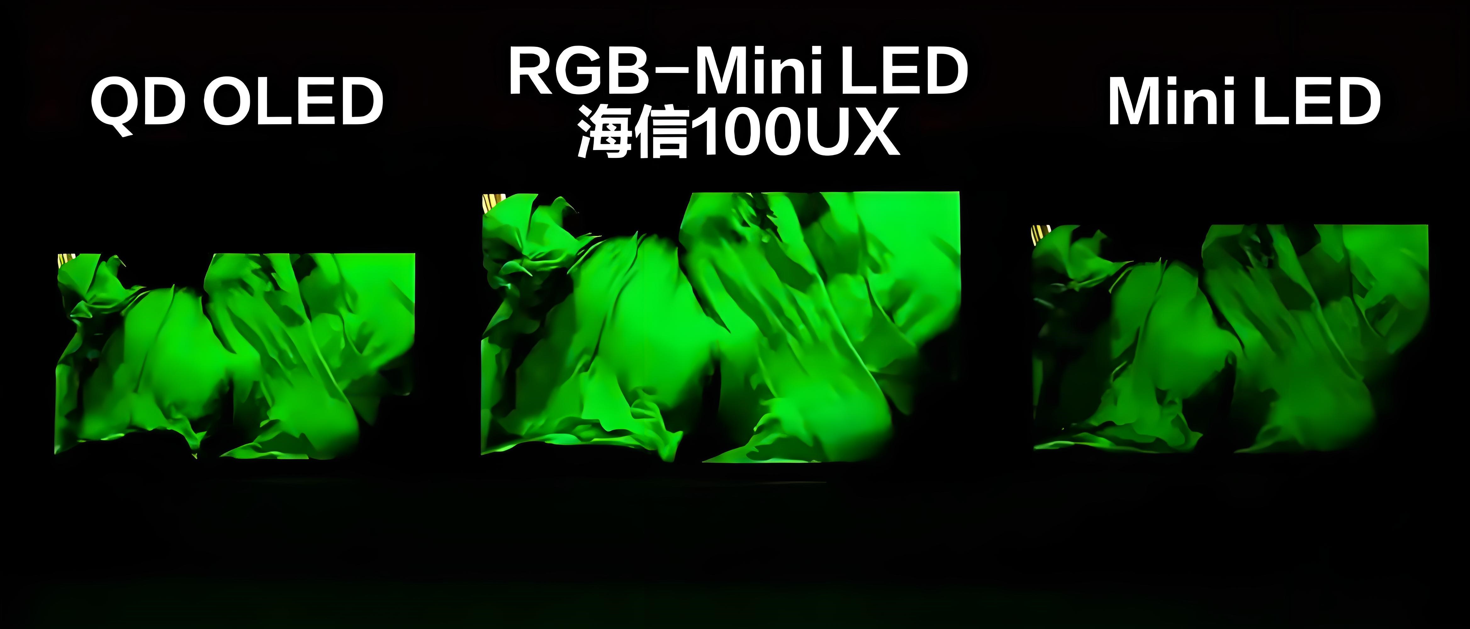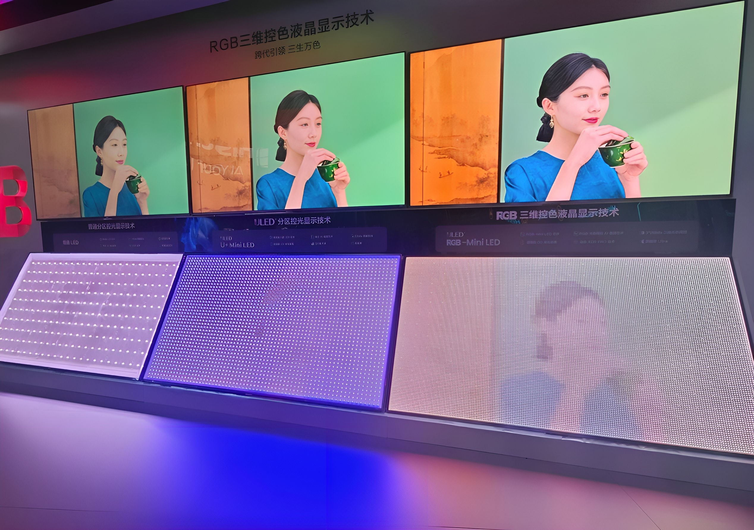 过去几年,Mini LED电视凭借更亮的画面和更深邃的黑色,成为不少人升级电视时的选择。但绝大多数Mini LED电视仍停留在“单色背光+色彩转换膜”的旧方案上,也就是所谓的 QD-Mini LED。这类技术需要在蓝色背光之上覆盖一层量子点膜,将蓝光转换为白光,再通过滤色片分出颜色。这层膜不仅造成色彩损失,还会阻挡光线、增加能耗。这解释了为什么有些高光场景会泛白,为什么色彩总觉得不够通透自然。