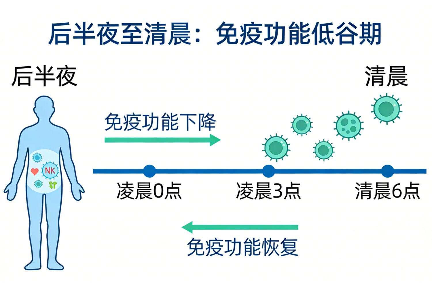 1、昼夜节律低谷:后半夜至清晨通常是免疫功能的生理性低谷期。研究表明,此时体内抗炎激素(如皮质醇)水平较低,某些免疫细胞活性也下降,可能导致对病原体的防御反应暂时减弱。