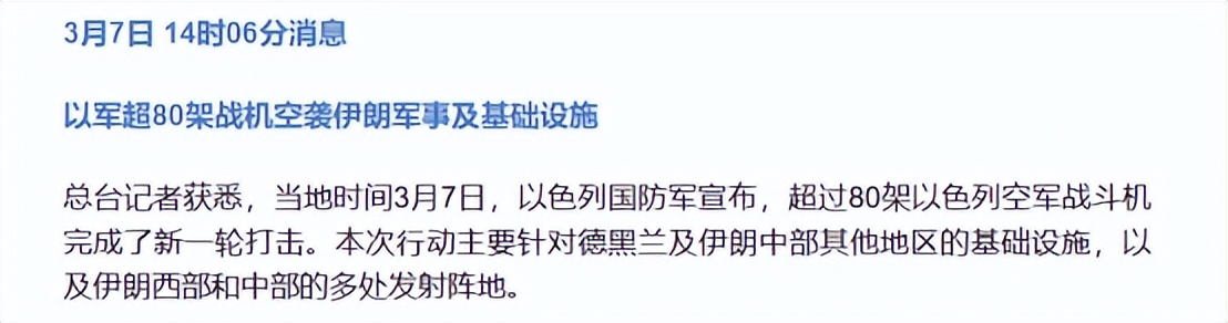 3月7日,以色列出动了超80架战斗机,他们针对德黑兰及伊朗中部其他地区的基础设施,完成了新一轮打击。