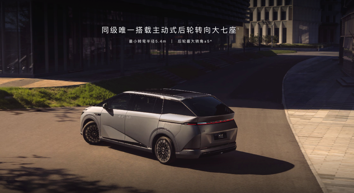 MPV常被戏称为“开船”,但2026款X9继续强化了其“灵活巨兽”的标签。新车全系标配主动式后轮转向,最小转弯半径仅为5.4m。这个数据甚至优于很多紧凑型轿车,在狭窄的老旧城区或商场地下车库,车长超过5.2米的X9依然可以实现“一把掉头”,极大地降低了日常驾驶的心理负担。