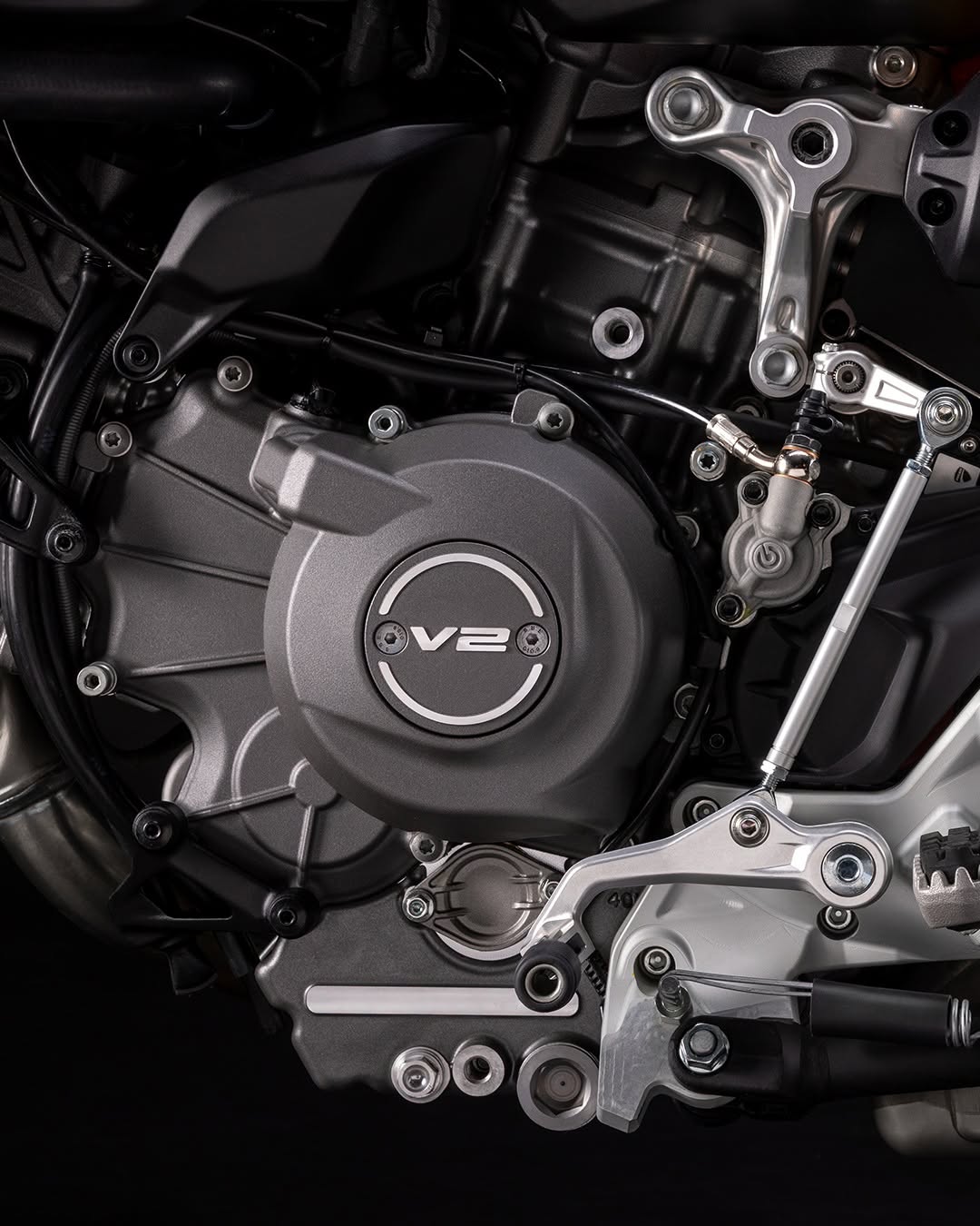 搭载了890 cc的双缸引擎,这是杜卡迪有史以来最轻的V2引擎,仅重54.4公斤。它采用了弹簧式气门驱动系统、IVT进气可变气门正时系统、铝制气缸套等先进技术。在10750rpm时,这款引擎能够产生88.5kW(120.4PS)的最大马力,在8250rpm时产生最大扭力94牛米。此外,气门间隙的检查周期延长至45000公里,为骑士提供了更加便捷的维护体验。同时,杜卡迪还提供了欧洲A2驾照规格的35kW版本,以满足不同骑士的需求。车架设计采用了Ducati近年标志性的Monocoque(单体式)车架,舍弃了传统的钢管式车架。这种设计不仅减轻了车架的重量,还提升了车辆的操控性和响应速度。在减重方面取得了显著成果,V2减至180kg,而V2SP低至177kg。880mm的标准座高,还可选装865mm低座高,油箱容量12.5升。