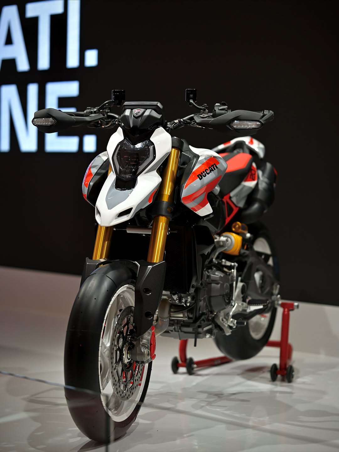 杜卡迪Hypermotard V2和SP版的前灯设计独特,带有独特的日间行车灯,这些灯安装在与前挡泥板一体化的灯罩内,为车辆增添了现代感和科技感。硕大、突出的油箱周围的设计与短小、截断的尾部形成鲜明对比,突显了类似越野摩托车的特性。从车头和车尾都能明显看到突出的油箱,这种设计不仅提升了车辆的外观,还增强了其越野风格。紧凑的车灯设计也为这款摩托车增添了一抹独特的魅力。