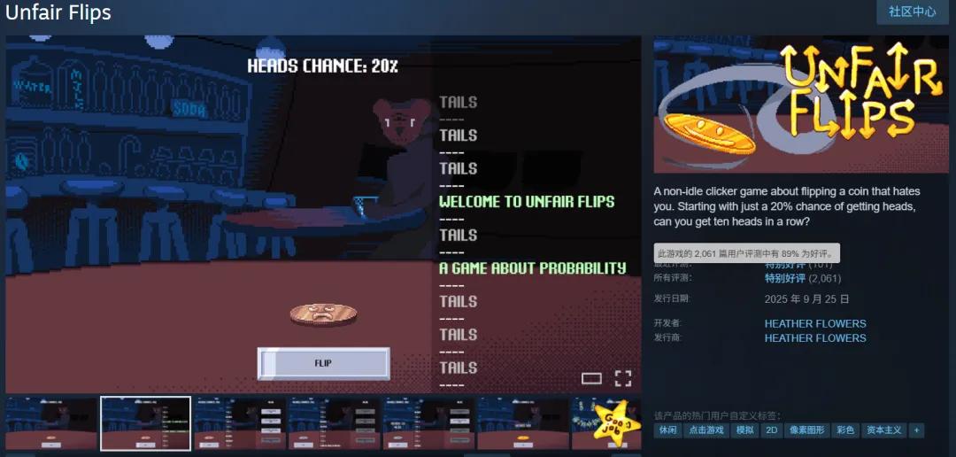 2025年9月,多款小众黑马再次沿着《幸运房东》的路线,打响了声势。其一是《四叶草深渊(CLOVERPIT)》为代表的新品,其二是《不公平的抛硬币(Unfair Flips)》为代表的新品。