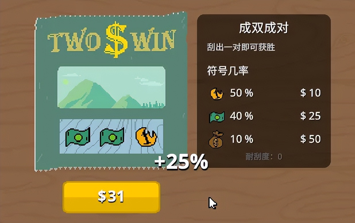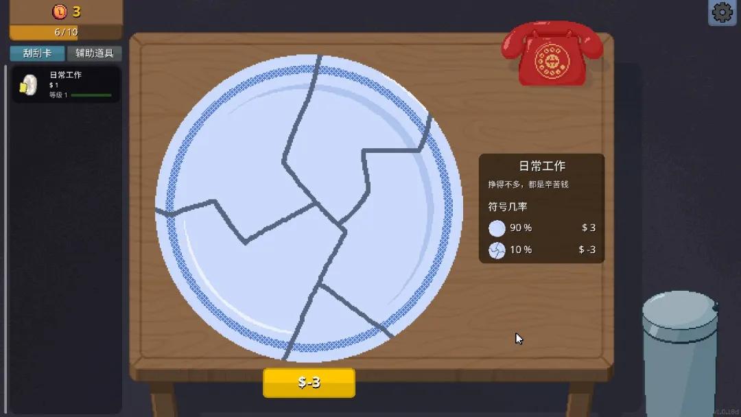 之前的擦盘子相当于一个教程,用一个小场景,引导玩家体验了“花钱购买盘子/彩票→擦干净/刮开遮蔽图层→赚钱/赔钱”这套流程。某种意义上,脏盘子属于回报率极低、回报效率慢、小概率会连本带利亏损的“变相刮刮乐”。