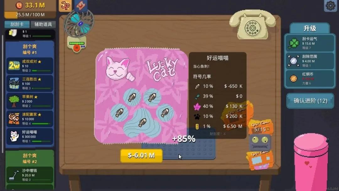 进入二周目后,有局外养成的快速启动,游戏刮奖赚钱的效率会随养成进度提升,同时解锁更多种类的刮刮乐。其中有新鲜的玩法,也有之前几种玩法的拓展形态。