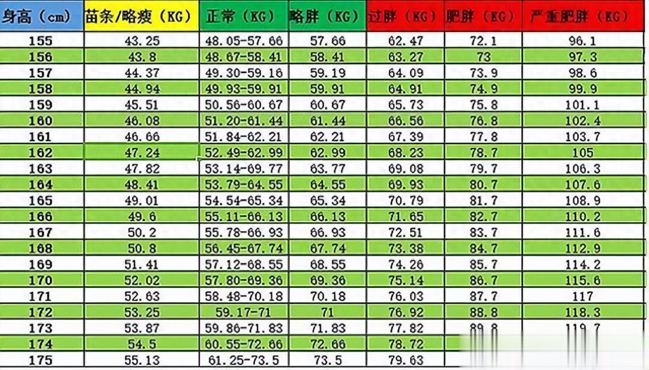 身高 155-175cm 女性标准体重对照表(建议收藏!)为了看得更清楚,我把每个身高对应的 “健康体重区间” 和 “理想体重参考”(取区间中间值)整理成了表格,姐妹们直接对号入座: