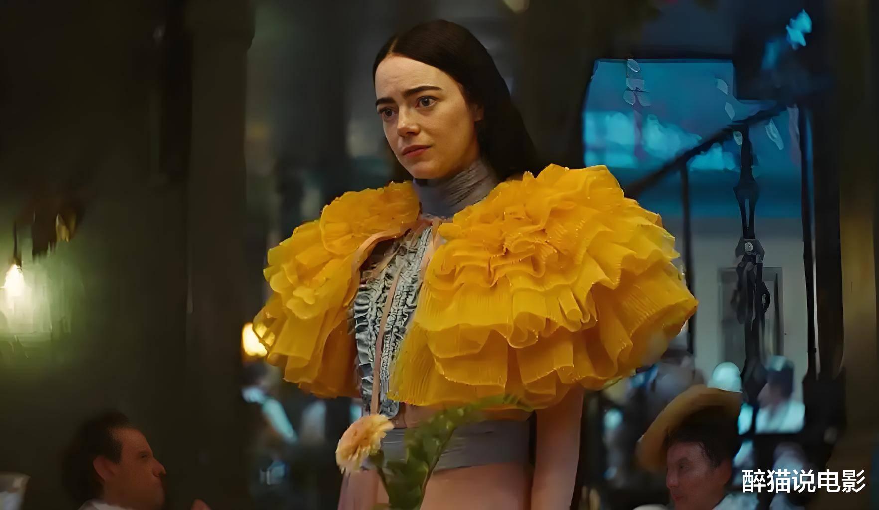 最炸裂的是“性觉醒”段落:贝拉跟放荡律师私奔,从“亲亲是什么”到“我要试试更多”,一路升级打怪,导演把床戏拍成彩色漫画,配上蒸汽朋克机械声,既羞耻又带感。观众刚想喊“女主好勇”,镜头立刻甩出时代耳光:街上男人骂她“怪物”,女人捂嘴偷笑,原来“自由”不只是滚床单,还要付社会帐单。
