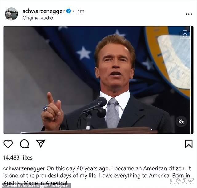 西方媒体表示,施瓦辛格所发布的照片表现了他在1983年自豪地宣誓成为美国公民。