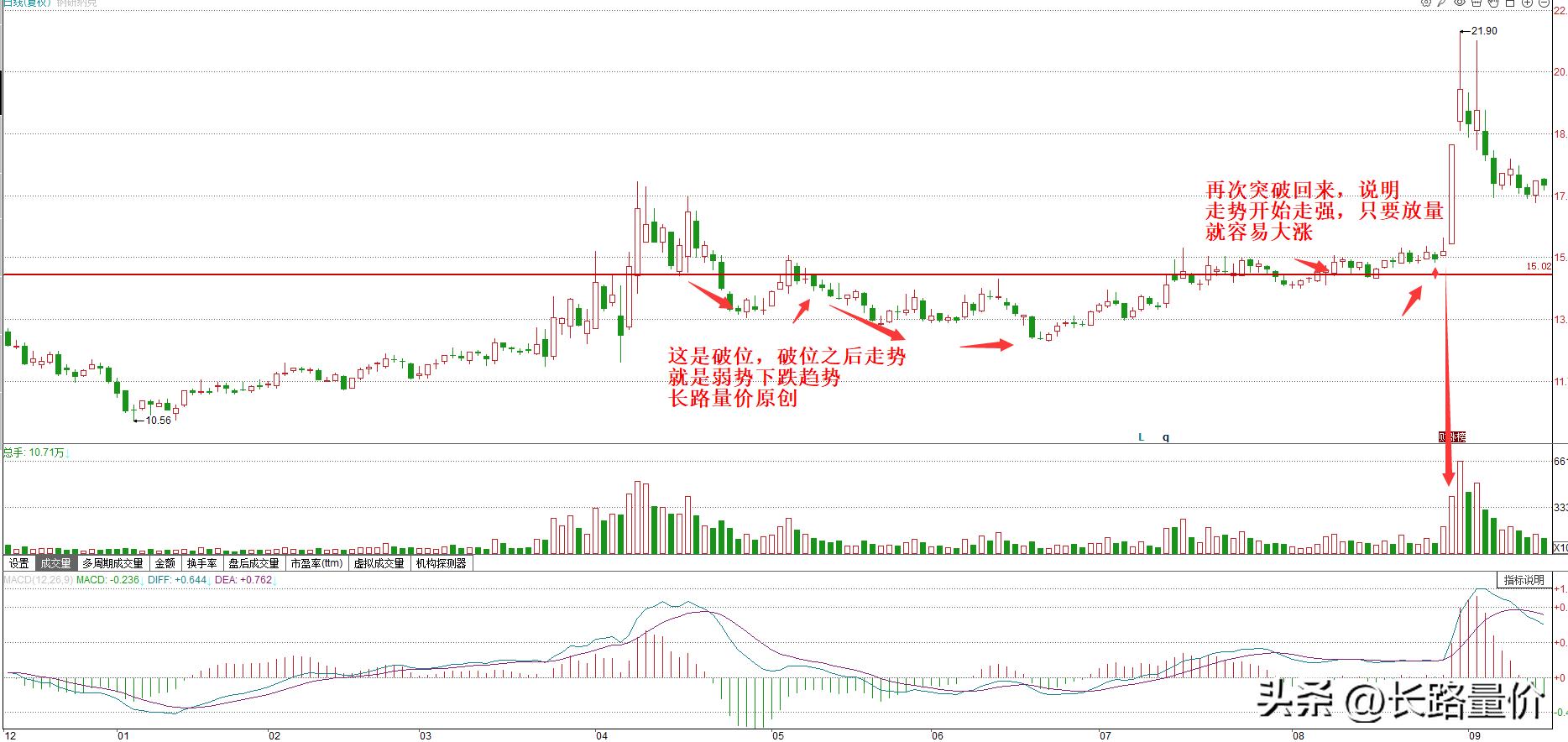 而强势的表现呢?就是在跌破这种放量的位置之后,有过一个长期横盘震荡整理的过程,在震荡整理之后,股价逐渐再次突破回到前期破位的震荡区间。