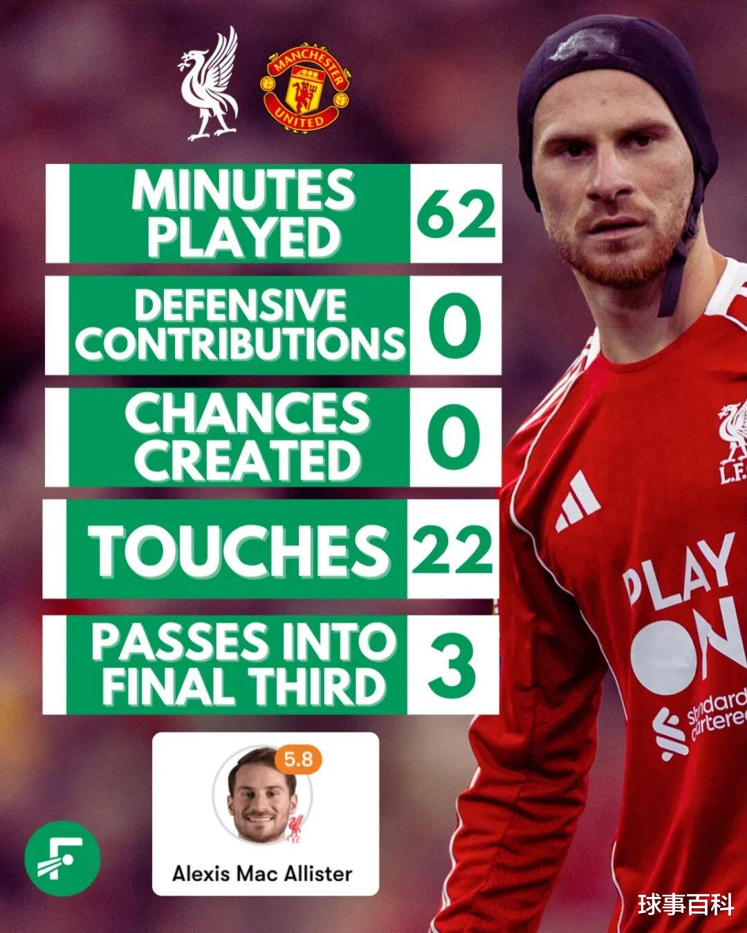 但在2025/26赛季,麦卡利斯特的发挥形同梦游。对阵曼联,他踢了62多分钟,仅22次触球、13脚传球、6次丢失球权——对一名中场核心来说,数字触目惊心。更让人咋舌的是,他0对抗成功,迅速成为众矢之的。一位利物浦博主在X上直言他是“队里最被高估的球员”,“在禁区到禁区之间慢得像快40岁的球员”。