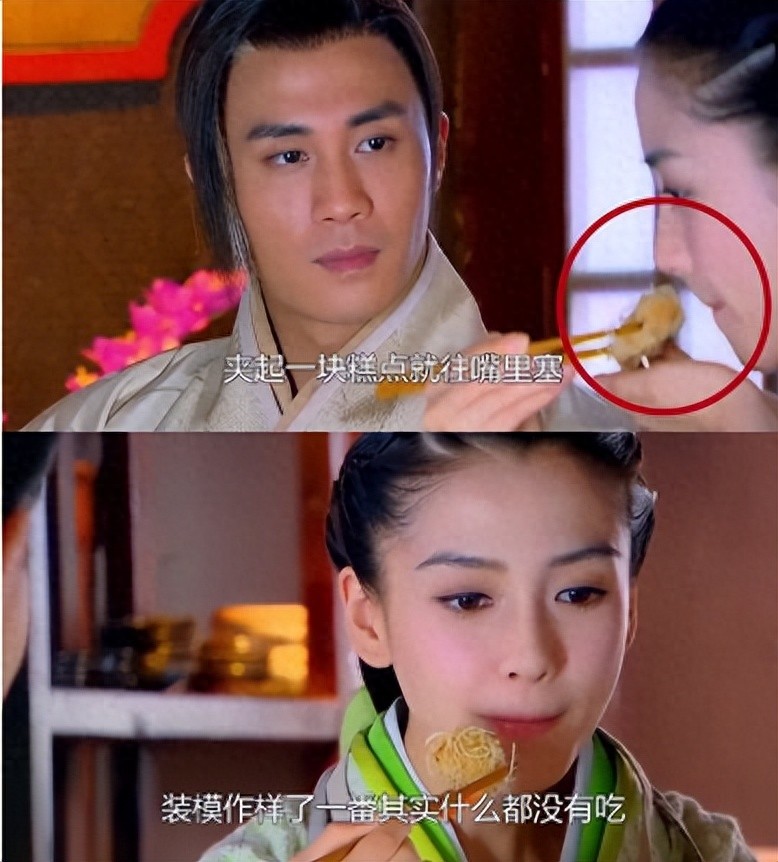 她只是轻轻咬了一小口,便用舌头顶起腮帮子来假装咀嚼,极力掩饰自己没有真吃的事实,原本充满烟火气的吃戏变得做作又虚假,让人大跌眼镜。