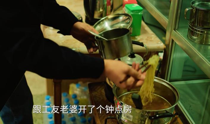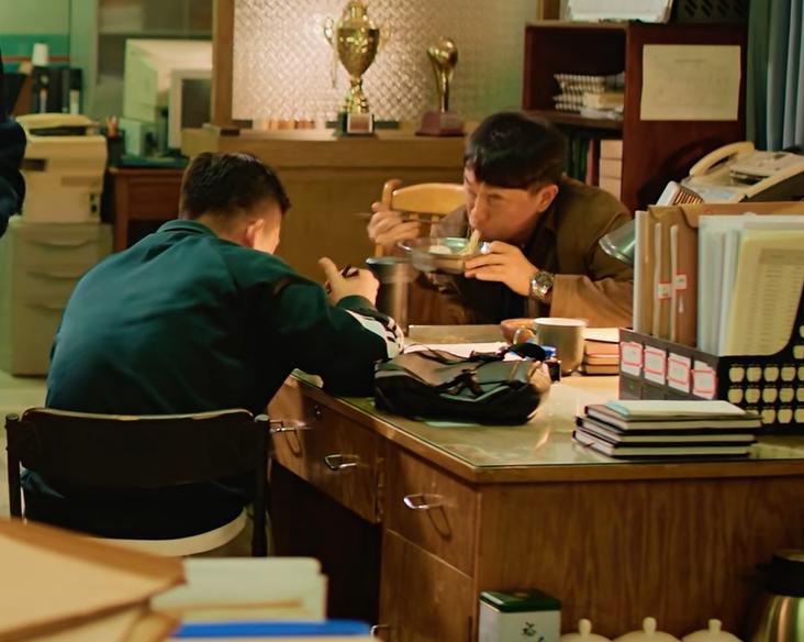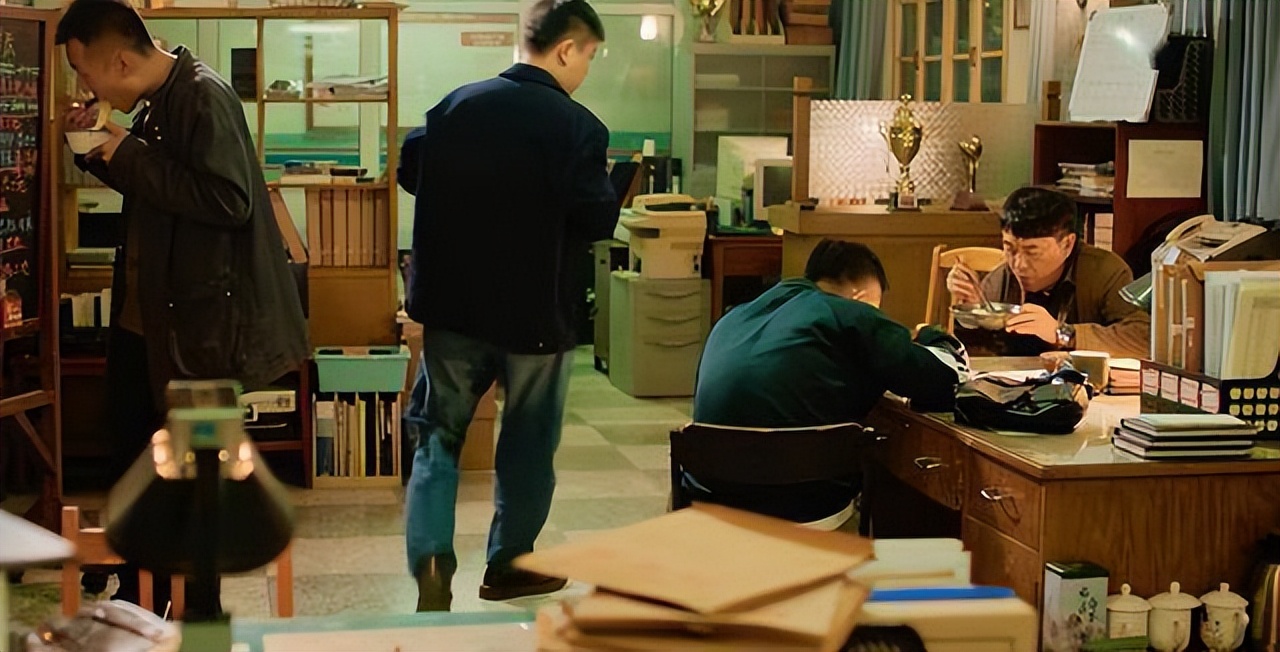 何冰饰演的老刑警,在忙碌的工作间隙,和同事们在局里煮泡面吃。
