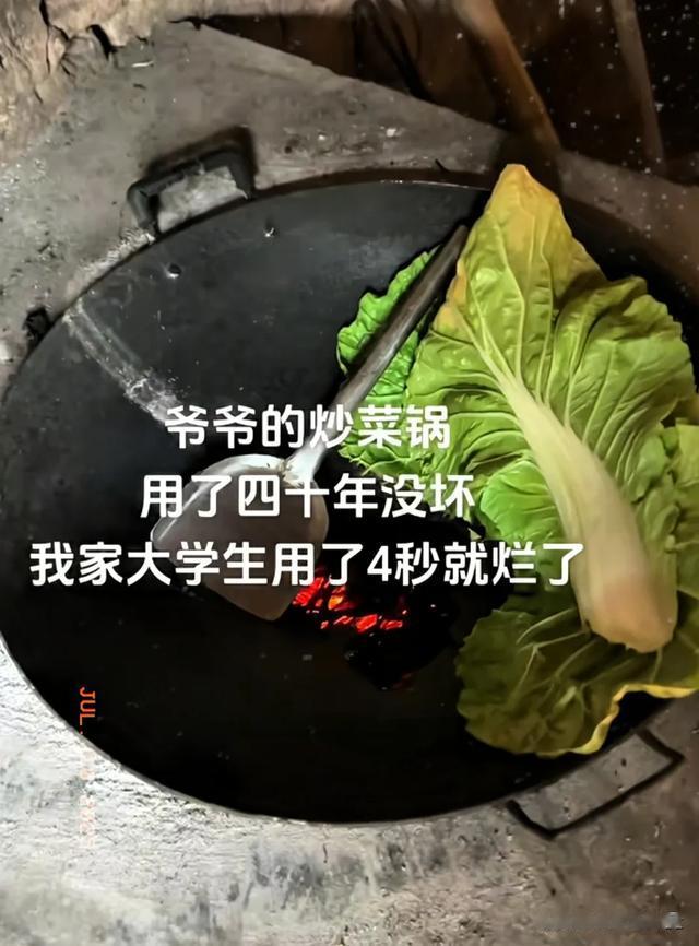 哎跟你说个事儿,你都不敢信!我爷爷那口炒菜锅啊,用了整整四十年了,锅底都包浆了,照样炒菜嘎嘎香,一点没坏。结果你猜怎么着?我家那刚上大学的小子,前两天用新锅做饭,好家伙,拿起来没两秒,“哐当”一下,不知道咋弄的,四秒钟就给整烂了!你说这对比,简直了,我瞅着都想笑