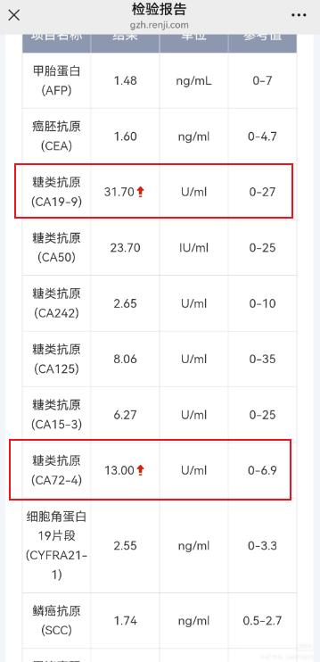 第一次复查时,糖类抗原ca242值为31.7轻微升高,糖类抗原ca72 - 4值为13,它们的升高提示肿瘤可能处于活跃状态,有复发转移的倾向。