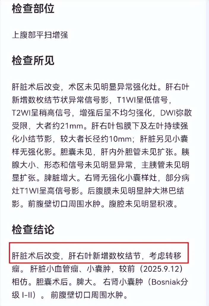 3个月后复查,肝脏右叶新增数枚结节,这无疑是肿瘤复发并转移的铁证,同时伴有肝脏小血管瘤、小囊肿等,胆囊已切除,脾大,右肾有小囊肿,前腹壁切口周围水肿,这些情况都表明张先生的身体在长期与肿瘤斗争过程中受到了多方面的影响。