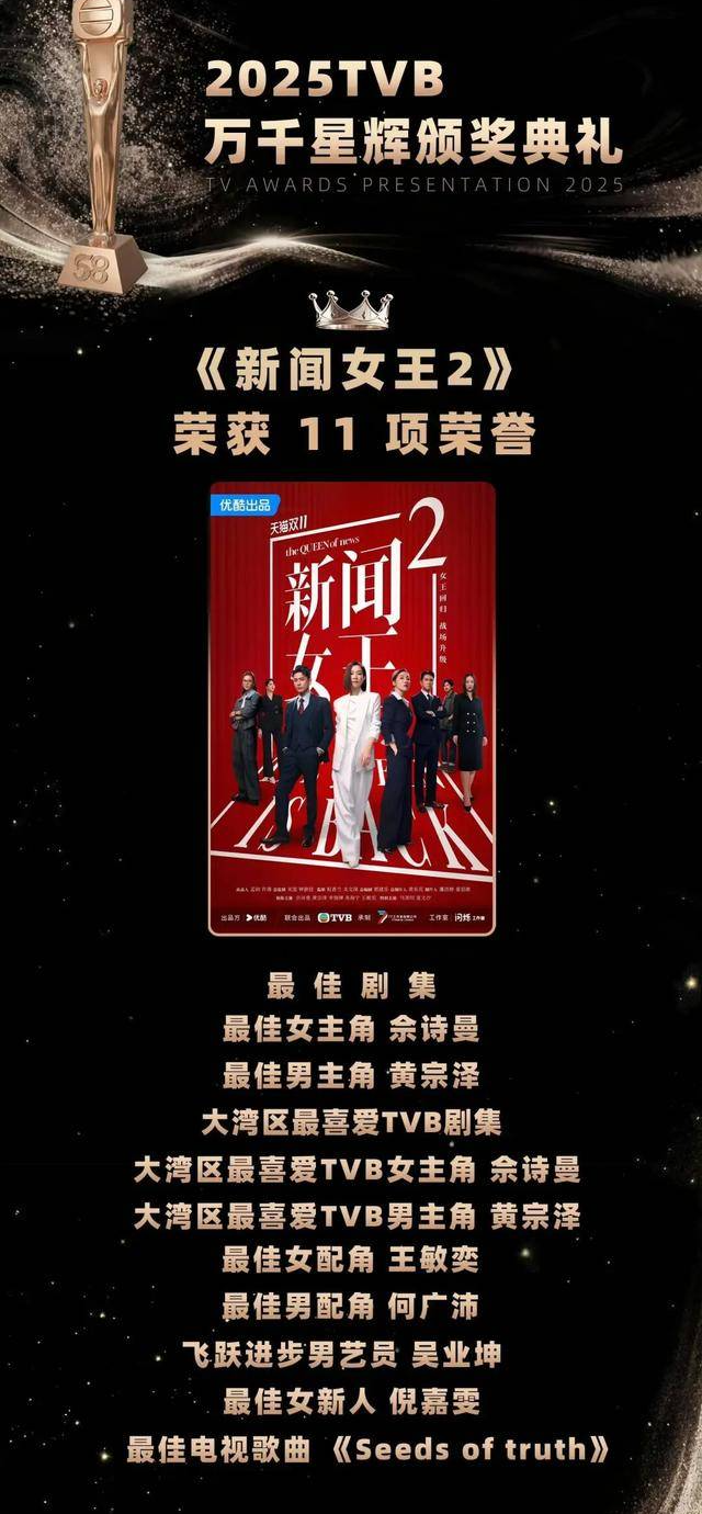 TVB年度盛事《万千星辉颁奖典礼2025》昨晚在澳门落下帷幕,整场颁奖礼下来,真正意义上的最大赢家,毫无悬念属于《新闻女王2》。