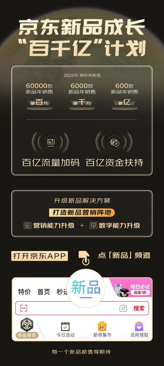2025年,从“京东小魔方”升级为“京东新品”,京东推出了新品成长“百千亿”计划,即在2025年加码百亿流量和百亿资金,并围绕营销能力与数字能力全面升级,目标是实现60000款新品年销售破百万、6000款新品年销售破千万、600款新品年销售破亿。