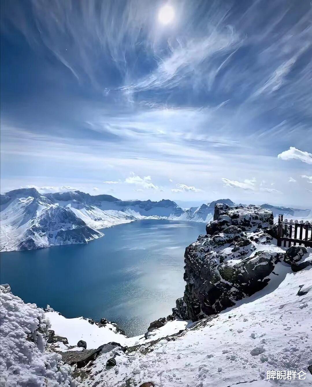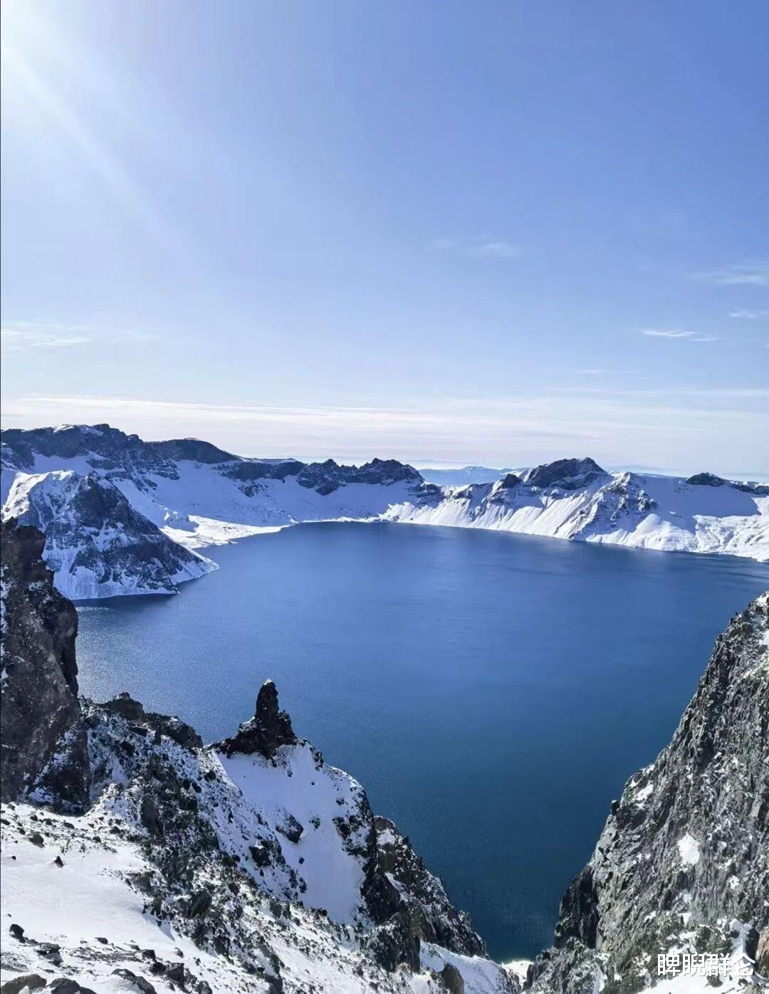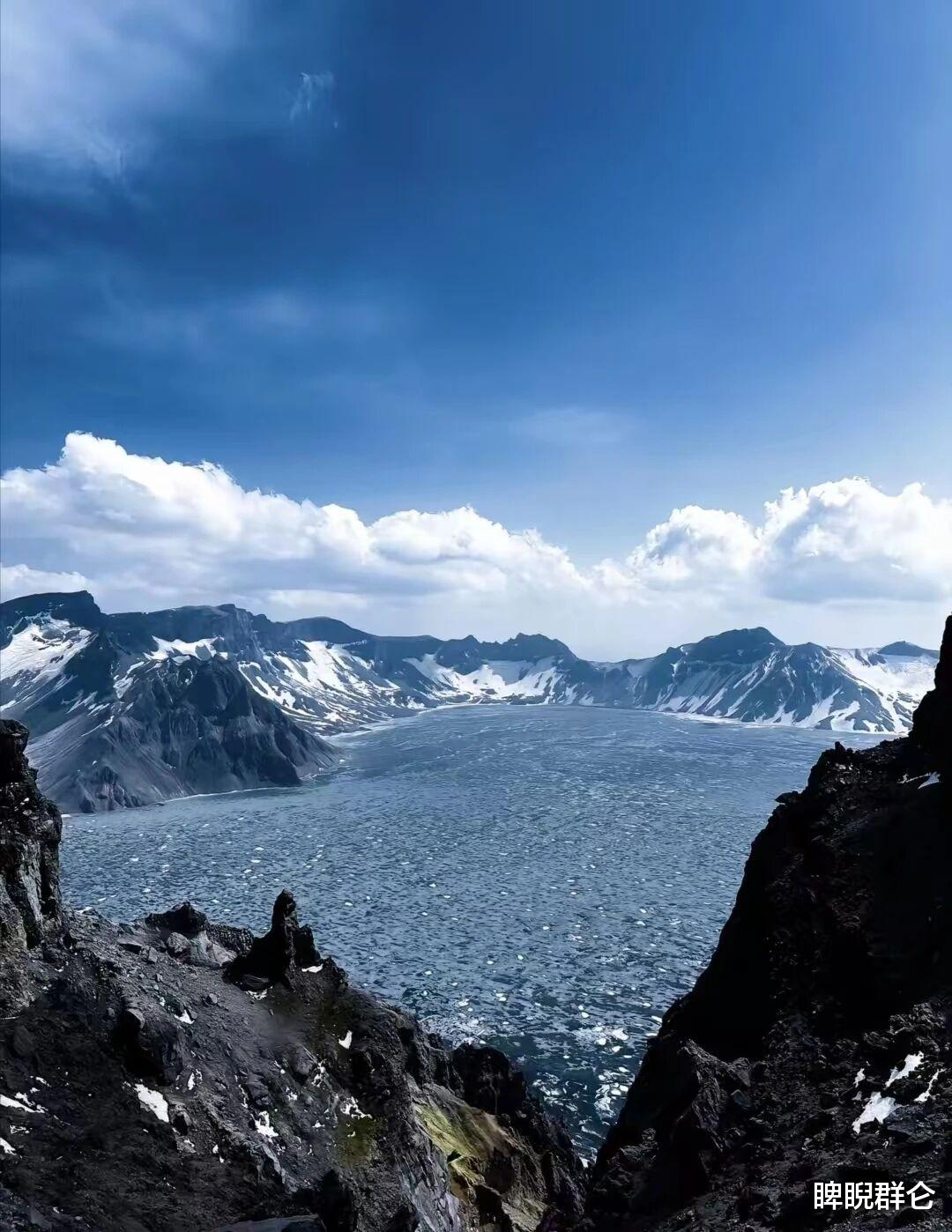 天池(北坡视角)从北坡看天池,需要换乘越野车登顶,车程约20分钟。虽然视角有部分山体遮挡,但震撼感丝毫不减。一汪清水被海拔超2000米的十六座山峰托举,湖面如镜,倒映着蓝天白云和残雪。