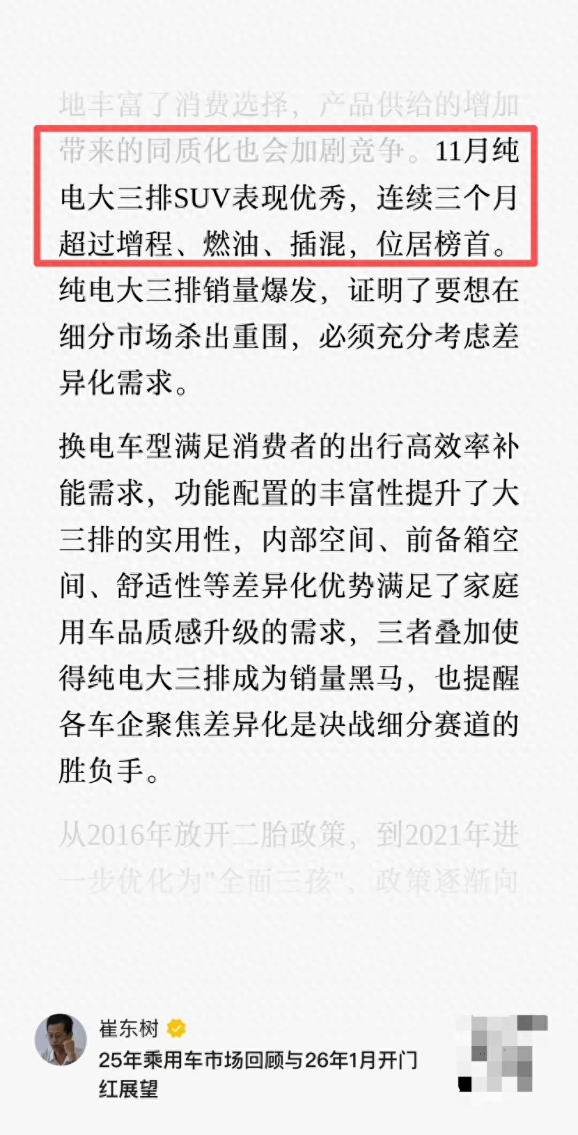 这场淘汰赛呈现出 “赢家通吃,边缘收缩”的显著特征。纯电大三排的销量成功,不仅为自己赢得了市场,更为整个纯电供应链、服务体系带来了规模效应和投资信心,形成正向循环。相反,增程市场增长停滞甚至萎缩,将导致其供应链成本劣势凸显,研发资源获取难度加大,在用户体验迭代上可能逐步落后。这种马太效应在技术变革期会被急剧放大。11月的数据就像一道分水岭,一侧是纯电大三排引领的、规模持续扩大的主流价值地带;另一侧,则是增程等技术路线被迫固守的、不断被挤压的细分或过渡市场。淘汰非主流的脚步声,已清晰可闻。