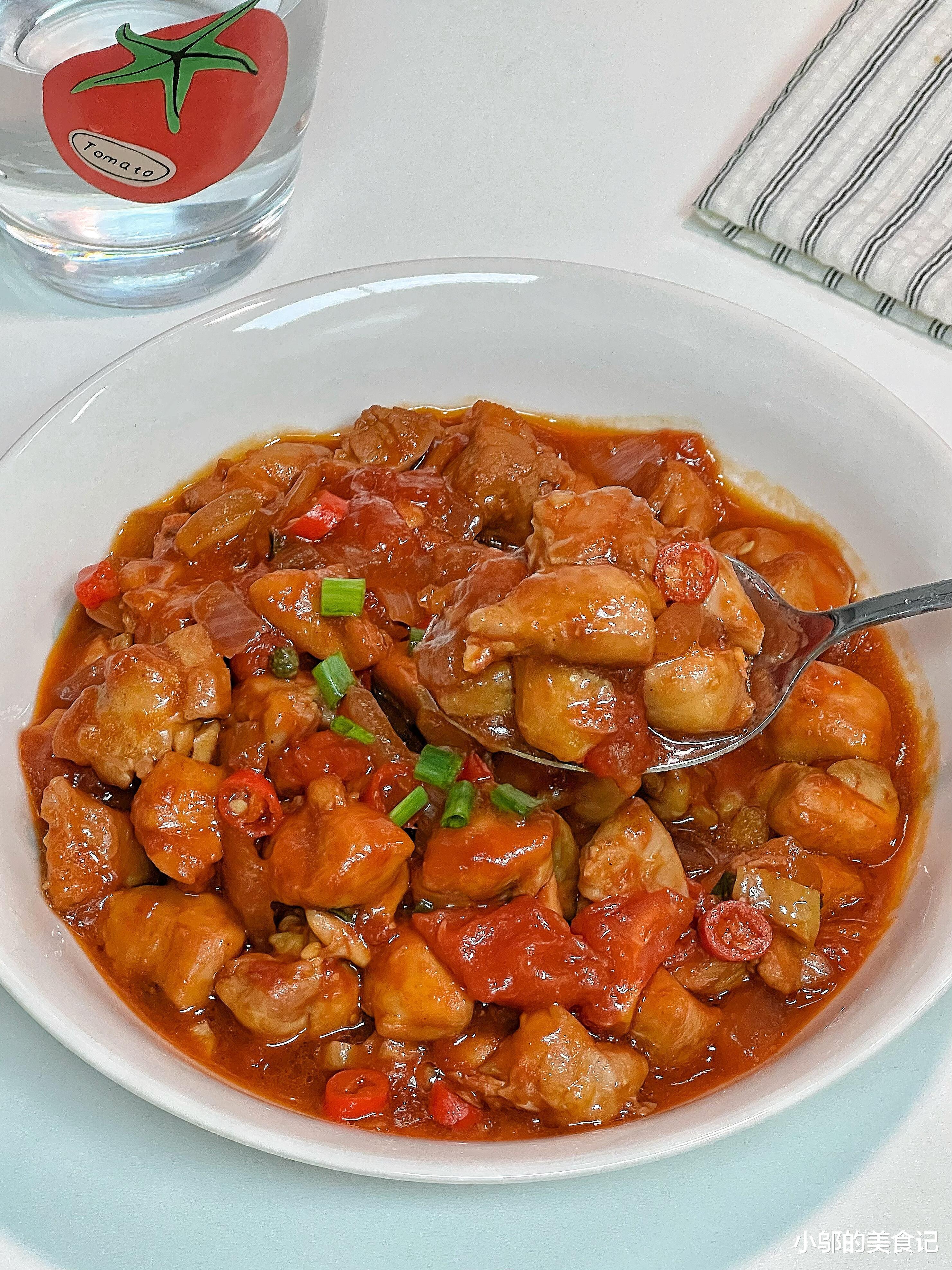 盛一碗热气腾腾的白米饭,浇上两勺酸辣番茄鸡的汤汁,夹几块鸡块和番茄,搅拌均匀后送入口中——鸡块的嫩滑、番茄的酸甜、香料的微辣在舌尖交织,汤汁裹着米粒,每一口都带着浓郁的家常烟火气,瞬间治愈了一天的疲惫。这道菜的魅力,在于它的“简单却惊艳”:不需要复杂的厨具,只需一口锅就能完成;食材也极为亲民,鸡腿肉、番茄、洋葱,皆是菜场常见的“熟面孔”,却能碰撞出令人沦陷的滋味。