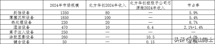 市占率方面,根据2024年的市场规模和公司收入计算,北方华创刻蚀、薄膜沉积、热处理、湿法设备的全球市占率分别为5.9%、5.4%、8.7%和2.1%;北方华创控股子公司芯源微的湿法、涂胶显影、键合设备的全球市占率分别为1.4%、4.0%和0.3%。