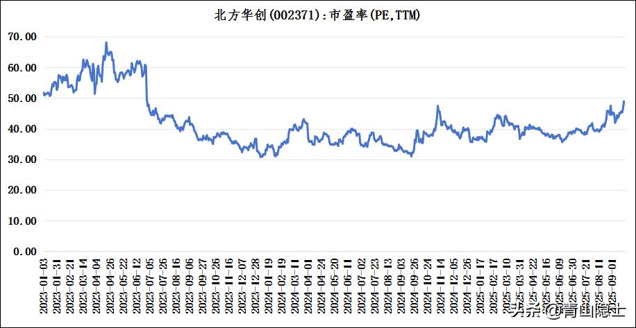 从2023年至今,北方华创的市盈率(TTM)一直在30倍上方,由此可以判断,“PEG等于1”可以作为判断北方华创的底部估值的依据。北方华创的顶部估值,大概是就是底部估值翻倍,也就是60倍市盈率附近。