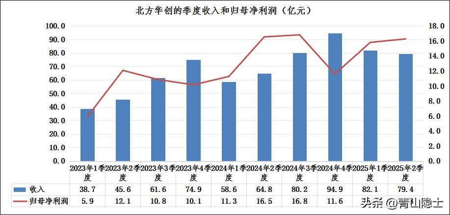 从2023年1季度至今,北方华创的收入和净利润始终保持震荡上行的趋势。以2季度收入为例,2023年2季度,北方华创的季度收入和利润分别为45.6亿元和12.1亿元;2025年2季度,北方华创的季度收入和利润分别为79.4亿元和16.3亿元。收入和利润的年复合增长率分别为32%和16%。