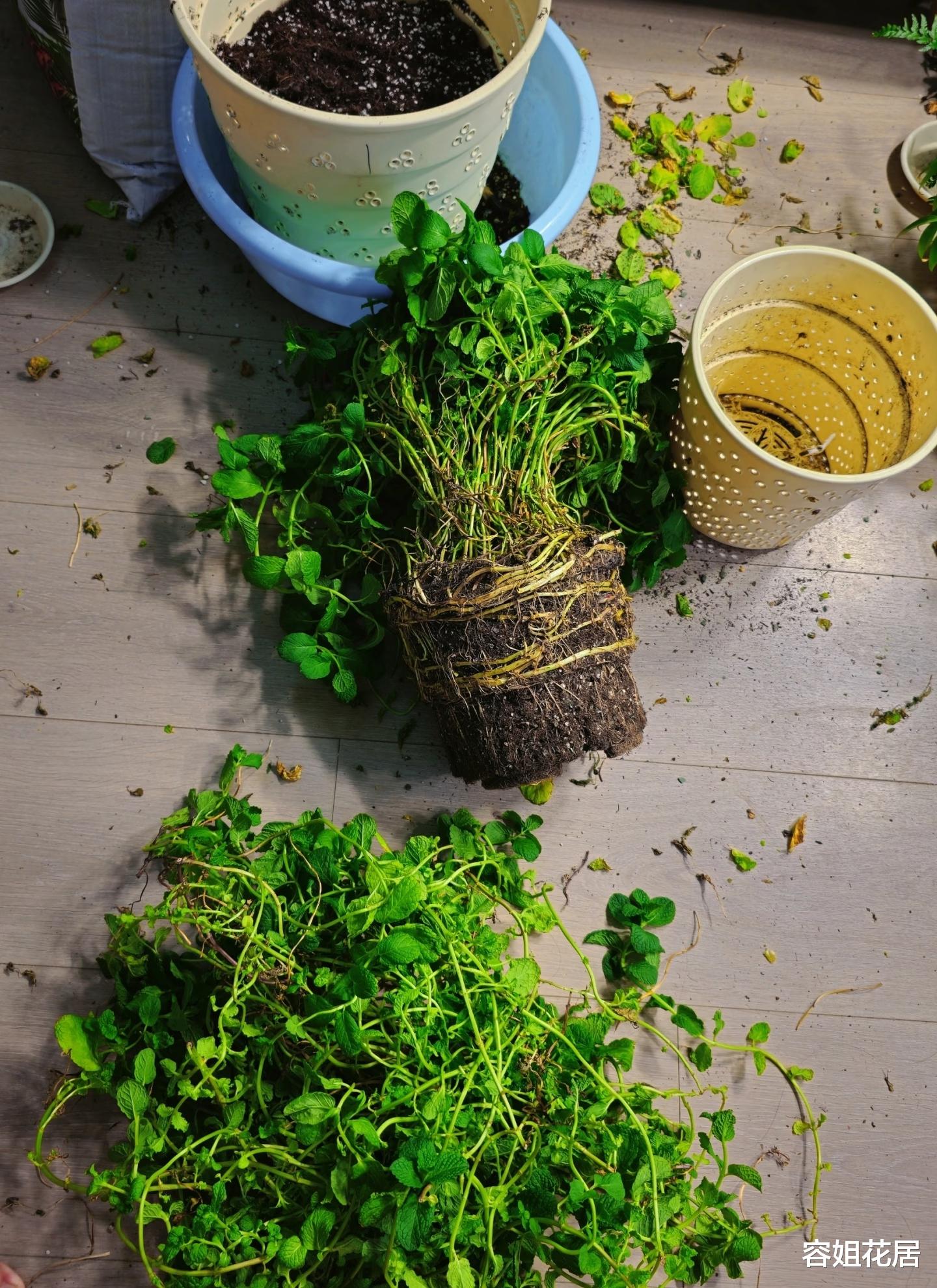 早在去年的时候,她的这盆薄荷下图这个样子的,小小的一盆,叶子还有些黄。可经过一年的养护,却变成了上图的样子。