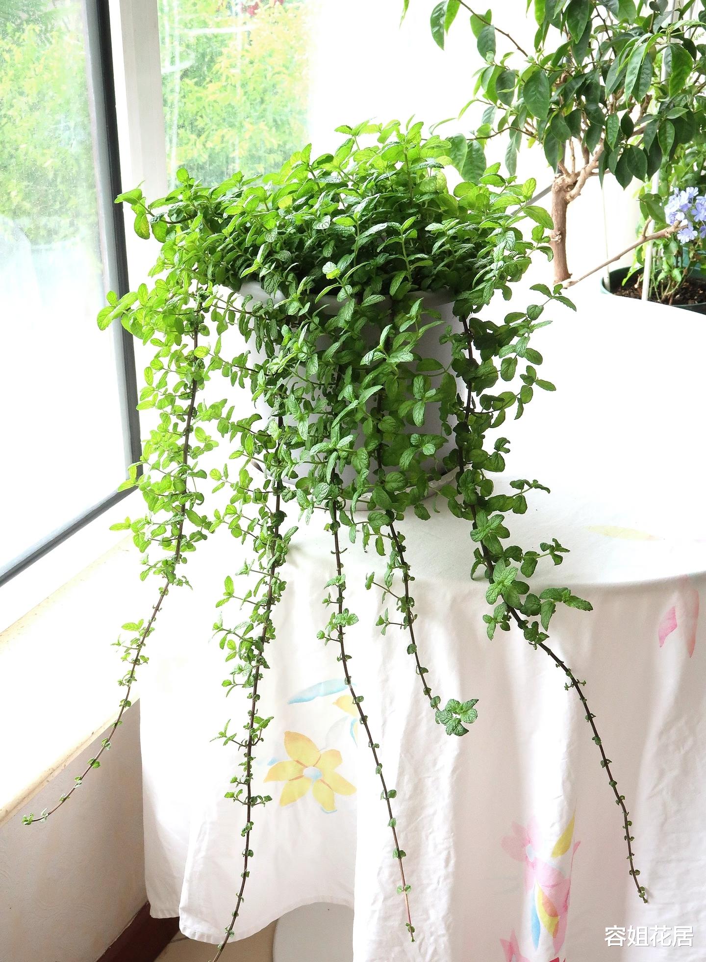 巧克力薄荷:它枝条生长速度也是很快的,而且枝条呈葡萄状生长,加上长出来的分枝特别多,这些枝条顺着花盆边缘向下流淌,也就变成了绿色的瀑布。