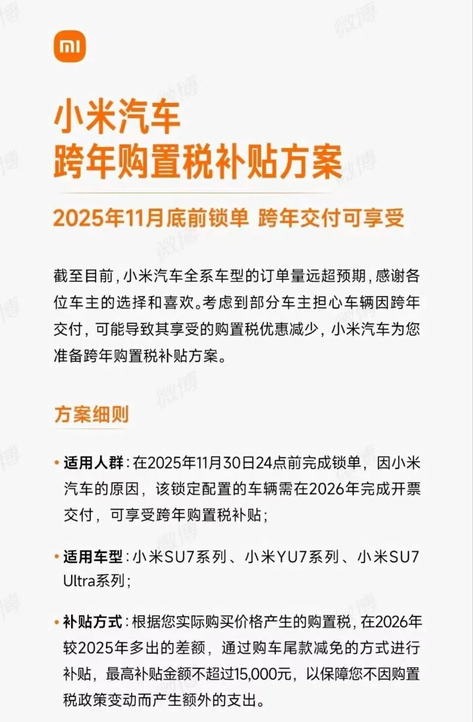 10月24日,小米汽车官方宣布为11月底前锁单的准车主提供跨年购置税补贴方案,简而言之,如果车主因为小米的原因无法在2025年内提车,小米汽车会通过购车尾款减免的方式为车主兜底2026年提车产生的购置税差额。