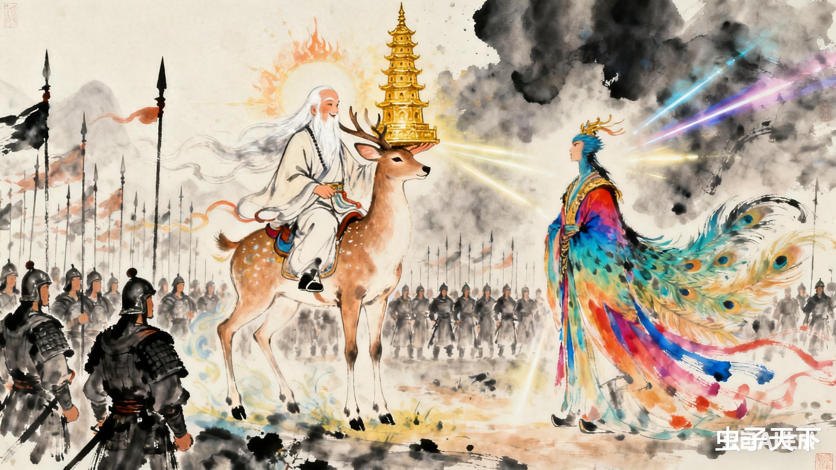 姜子牙帐下的燃灯道人骑着仙鹿来了,这老道白须飘飘,手里托着座黄金塔,笑眯眯对孔宣说:“道友,你逆天而行,不如归顺周王,修个正果?”